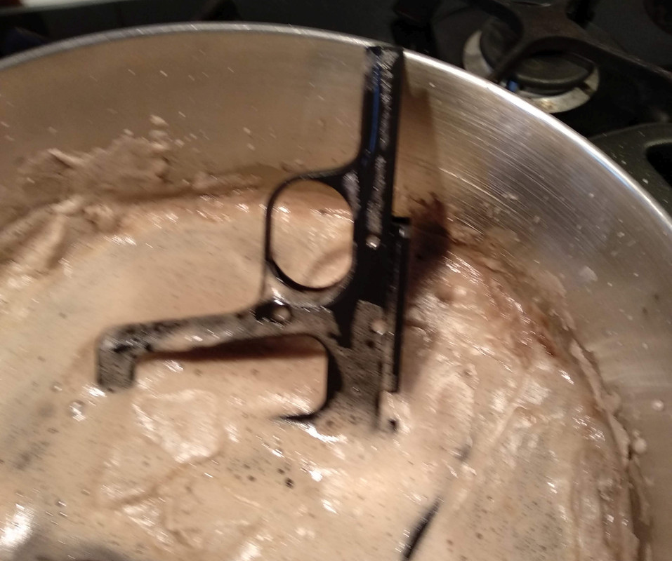 Пистолет валялся в таком виде довольно долго, и я неторопливо искал, как бы его заворонить. Платить оружейнику $200 за обработку пистолета, который стоит $250 не хотелось, я рассматривал возможности использовать жидкости для «холодного воронения», но они тоже не дешевые, к тому же было не ясно, как их применять для всего пистолета, а не только для маленького участка, и постепенно стало ясно что единственная нормальная возможность заворонить пистоль - горячее воронение.
