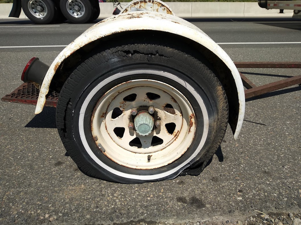 Километров через 20, уже на хайвее, я увидел, что от правого колеса полетели куски и услышал характерное шлеп-шлеп-шлеп.