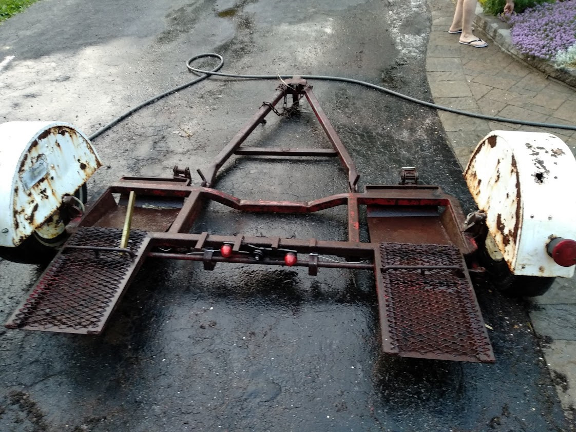 Дома рассмотрел тележку — сделана неплохо, в 1985, приятно что она качающаяся, то есть чтобы загнать на нее машину, не нужны отдельные рампы.